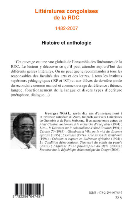 Cet ouvrage est une vue globale de l'ensemble des littératures de la RDC. Le lecteur y découvre ce qu'il peut attendre aujourd'hui des différents genres littéraires. On ne peut que le recommander à tous les responsables des facultés des arts et des lettres, à tous les instituts supérieurs pédagogiques (ISP et IST) et aux élèves de dernière année du secondaire comme manuel et comme ouvrage de référence : thèmes, langue, fonctionnement de la langue et divers types d'écriture (métaphore, dialogue...).
