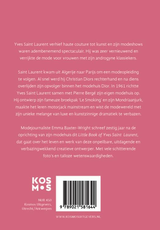In Little Book of Yves Saint Laurent lees je alles over zijn ontwikkeling van modestudent tot rechterhand van Christian Dior. In 1961 richtte Yves Saint Laurent samen met Pierre Bergé zijn eigen modehuis op. Hij ontwierp het beroemde broekpak ‘Le Smoking’ en zijn Mondriaanjurk, maakte het leren motorjack mainstream en wist de modewereld te verbazen met zijn unieke mix van elegantie en artistiek drama in zijn ontwerpen.
