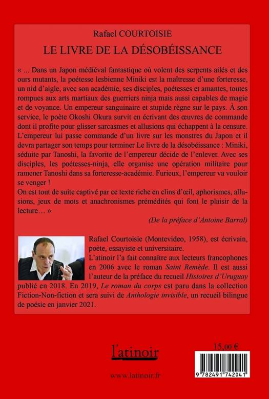 Le livre de la désobéissance se déroule dans un Japon sanglant, magique et de ce fait, bien réel. Intrigues de palais, assassinats d'une cruauté raffinée, empoisonnements sophistiqués, exploits guerriers et merveilles littéraires servent la trame d'un récit qui désobéit à l'Histoire pour mieux en raconter les vérités profondes et n'hésite pas à parodier Akutagawa, Mishima et Murakami ou à leur rendre hommage. Une fiction qui montre que le Japon n'est qu'un autre nom de l'aventure humaine quelqu'en soit le langage, quelque soit le moment de l'Histoire et quelque soit l'endroit dans le monde.