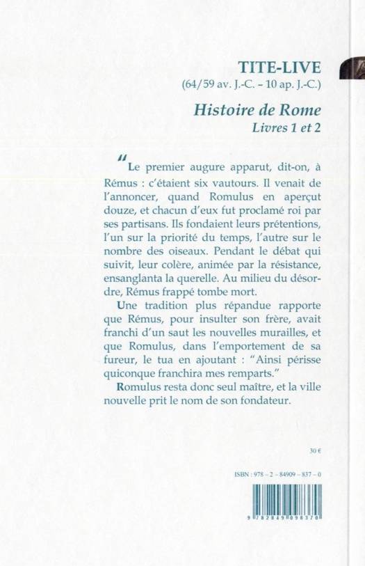 Le premier augure apparut, dit-on, à Rémus : c'étaient six vautours. Il venait de l'annoncer, quand Romulus en aperçut douze, et chacun d'eux fut proclamé roi par ses partisans. Ils fondaient leurs prétentions, l'un sur la priorité du temps, l'autre sur le nombre des oiseaux. Pendant le débat qui suivit, leur colère, animée par la résistance, ensanglanta la querelle. Au milieu du désordre, Rémus frappé tombe mort.