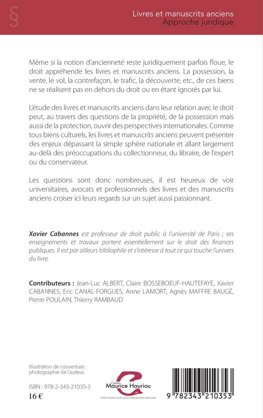 Même si la notion d'ancienneté reste juridiquement parfois floue, le droit appréhende les livres et manuscrits anciens. La possession, la vente, le vol, la contrefaçon, le trafic, la découverte, etc., de ces biens ne se réalisent pas en dehors du droit ou en étant ignorés par lui. L'étude des livres et manuscrits anciens dans leur relation avec le droit peut, au travers des questions de la propriété, de la possession mais aussi de la protection, ouvrir des perspectives internationales. Comme tous biens culturels, les livres et manuscrits anciens peuvent présenter des enjeux dépassant la simple sphère nationale et allant largement au-delà des préoccupations du collectionneur, du libraire, de l'expert ou du conservateur.