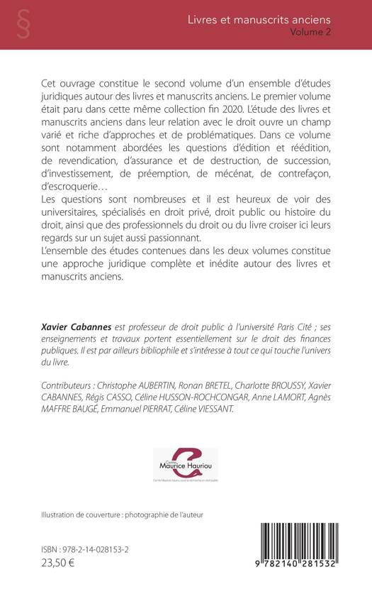 Cet ouvrage constitue le second volume d'un ensemble d'études juridiques autour des livres et manuscrits anciens. Le premier volume était paru en 2020. L'étude des livres et manuscrits anciens dans leur relation avec le droit ouvre un champ varié et riche d'approches et de problématiques. Dans ce volume sont notamment abordées les questions d'édition et réédition, de revendication, d'assurance et de destruction, de succession, d'investissement, de préemption, de mécénat, de contrefaçon, d'escroquerie... Les questions sont nombreuses et il est heureux de voir des universitaires, spécialisés en droit privé, droit public ou histoire du droit, ainsi que des professionnels du droit ou du livre croiser ici leurs regards sur un sujet aussi passionnant. L'ensemble des études contenues dans les deux volumes constitue une approche juridique complète et inédite autour des livres et manuscrits anciens.