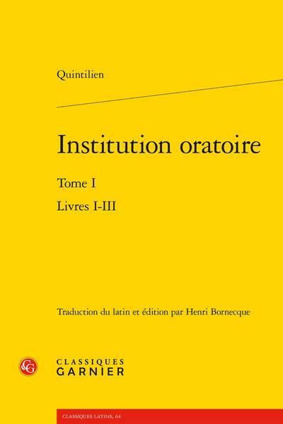 Au terme d'une vie d'enseignement, le grand orateur Quintilien rédige ce qui constitue le manuel de rhétorique le plus complet de l'Antiquité, mais aussi un véritable traité de pédagogie. Car, au-delà des considérations théoriques, l'éloquence est affaire de pratique et d'éducation. Ainsi, c'est dès l'enfance que Quintilien propose d'entamer la formation oratoire. Ensuite viennent les techniques de l'orateur, tant pour imaginer et composer son discours en fonction des circonstances que pour le mémoriser, le prononcer et lui donner ampleur et force de conviction. Renommée durant l'Antiquité, cette somme sur l'art oratoire joua un rôle central chez les humanistes de la Renaissance et dans la formation intellectuelle de l'Occident.