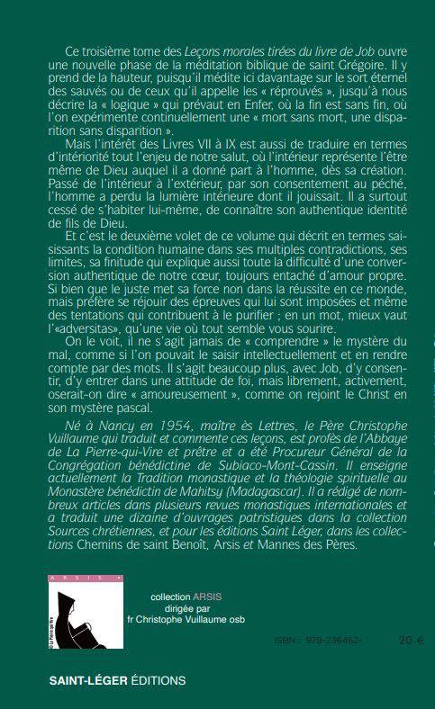Ce troisième tome des Leçons morales tirées du livre de Job ouvre une nouvelle phase de la méditation biblique de saint Grégoire. Il y prend de la hauteur, puisqu’il médite ici davantage sur le sort éternel des sauvés ou de ceux qu’il appelle les « réprouvés », jusqu’à nous décrire la « logique » qui prévaut en Enfer, où la fin est sans fin, où l’on expérimente continuellement une « mort sans mort, une disparition sans disparition ». Mais l’intérêt des Livres VII à IX est aussi de traduire en termes d’intériorité tout l’enjeu de notre salut, où l’intérieur représente l’être même de Dieu auquel il a donné part à l’homme, dès sa création. Passé de l’intérieur à l’extérieur, par son consentement au péché, l’homme a perdu la lumière intérieure dont il jouissait. Il a surtout cessé de s’habiter luimême, de connaître son authentique identité de fils de Dieu.