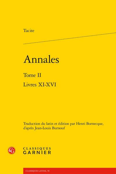Modernisant la vieille méthode des annalistes romains, qui listaient les événements survenus dans l'année (annus), Tacite s'intéresse aux règnes de Tibère, Caligula, Claude et Néron, les empereurs julio-claudiens qui succédèrent à Auguste. Nostalgique de la liberté qui s'épanouissait sous la République mais conscient du rôle du régime augustéen dans le rétablissement de la paix civile, Tacite développe une pensée historique et politique fine, attentive aux effets des événements sur les coeurs et les esprits. Il y a chez l'historien une obscure clarté, faite de périodes, de variations et de ruptures, que son analyse pénétrante des évolutions du régime impérial et des ressorts psychologiques profonds rend encore plus saillante et frappante.