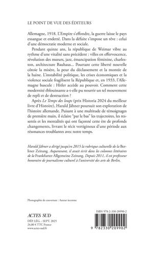 Après "Le Temps des loups" (prix Historia 2024 du meilleur livre d'histoire), Harald Jähner plonge le lecteur au coeur d'une autre période charnière de l'histoire allemande : la République de Weimar (1918-1933), et dresse le portrait saisissant de cette « courte vie entre les guerres », où l'euphorie de la modernité côtoyait l'angoisse d'un avenir incertain. Dynamiques sociales explosives face aux crises, turbulences politiques profondes et paradoxes économiques : Harald Jähner ausculte les états d'âme collectifs de cette période fascinante dans un ouvrage essentiel pour qui veut comprendre les racines du XXe siècle.
