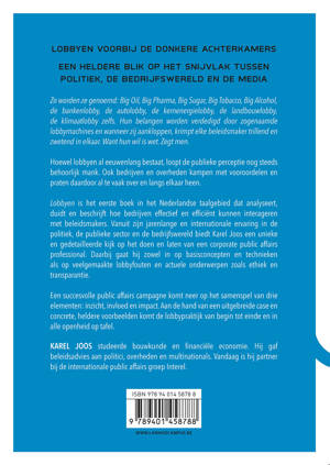 Lobbyen is het eerste boek in het Nederlandse taalgebied dat analyseert, duidt en beschrijft hoe bedrijven effectief en efficiënt kunnen interageren met beleidsmakers. Vanuit zijn jarenlange en internationale ervaring in de politiek, de publieke sector en de bedrijfswereld biedt Karel Joos een unieke en gedetailleerde kijk op het doen en laten van een corporate public affairs professional. Daarbij gaat hij zowel in op basisconcepten en technieken als op veelgemaakte lobbyfouten en actuele onderwerpen zoals ethiek en transparantie.