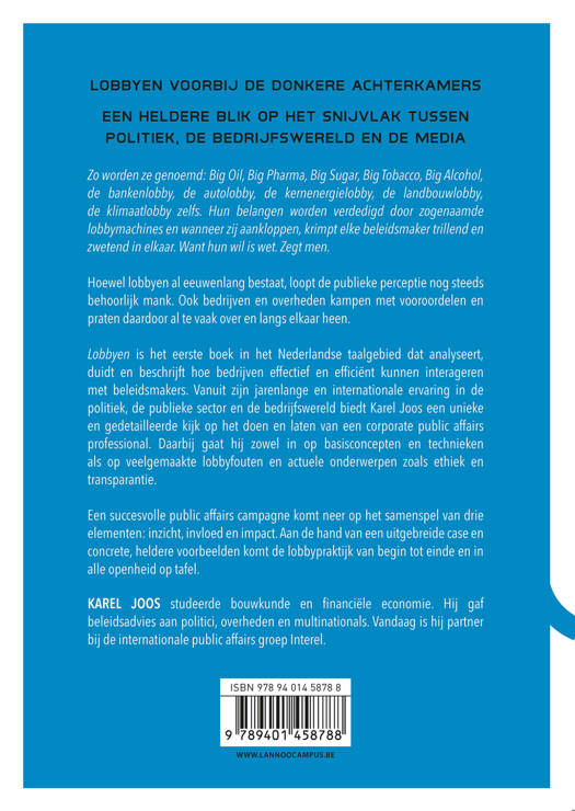 Lobbyen voorbij de donkere achterkamers Een heldere blik op het snijvlak tussen politiek, de bedrijfswereld en de media Zo worden ze genoemd: Big Oil, Big Pharma, Big Sugar, Big Tobacco, Big Alcohol, de bankenlobby, de autolobby, de kernenergielobby, de landbouwlobby, de klimaatlobby zelfs. Hun belangen worden verdedigd door zogenaamde lobbymachines en wanneer zij aankloppen, krimpt elke beleidsmaker trillend en zwetend in elkaar. Want hun wil is wet. Zegt men. Hoewel lobbyen al eeuwenlang bestaat, loopt de publieke perceptie nog steeds behoorlijk mank. Ook bedrijven en overheden kampen met vooroordelen en praten daardoor al te vaak over en langs elkaar heen. Lobbyen is het eerste boek in het Nederlandse taalgebied dat analyseert, duidt en beschrijft hoe bedrijven effectief en efficiënt kunnen interageren met beleidsmakers. Vanuit zijn jarenlange en internationale ervaring in de politiek, de publieke sector en de bedrijfswereld biedt Karel Joos een unieke en gedetailleerde kijk op het doen en laten van een corporate public affairs professional. Daarbij gaat hij zowel in op basisconcepten en technieken als op veelgemaakte lobbyfouten en actuele onderwerpen zoals ethiek en transparantie. Een succesvolle public affairs campagne komt neer op het samenspel van drie elementen: inzicht, invloed en impact. Aan de hand van een uitgebreide case en concrete, heldere voorbeelden komt de lobbypraktijk van begin tot einde en in alle openheid op tafel.