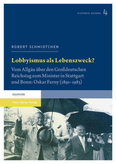 Adenauer, Heuss, Kiesinger, Lübke, Rommel – große Namen der deutschen Geschichte mit einer Gemeinsamkeit: Alle reisten ins württembergische Allgäu um Oskar Farny zu treffen. Nach dem Ersten Weltkrieg begann Farnys politische Karriere, die Wahl in den Stuttgarter Landtag bildete 1920 den vorläufigen Höhepunkt. Nach kürzester Zeit legte er sein Mandat zu Gunsten wirtschaftlicher Tätigkeiten nieder. Von 1933 bis 1945 saß er als parteiloser Hospitant der NSDAP-Fraktion im Reichstag. Nach Kriegsende blieb ihm die angestrebte CDU-Mitgliedschaft lange verwehrt, so dass er zunächst in die CSU eintrat. Gebhard Müller, Ministerpräsident Baden-Württembergs, ermöglichte Farny ab 1953 eine zweite politische Karriere. Im selben Jahr wurde er Abgeordneter des Deutschen Bundestages und kurz darauf Landesminister von Baden-Württemberg, sogar das Amt des Ministerpräsidenten Baden-Württembergs wurde ihm 1958 angetragen. 1960 trat er auf eigene Veranlassung von allen höheren Ämtern zurück. Robert Schmidtchen zeichnet die ungewöhnliche Karriere eines Politikers aus der zweiten Reihe nach: ein Lobbyist mit Mandat, der als einziger Abgeordneter des Großdeutschen Reichstags in den Bundestag gelangte.