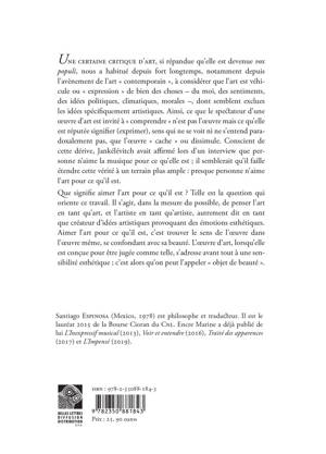 Une certaine critique d'art, si repandue qu'elle est devenue vox populi, nous a habitue depuis fort longtemps, notamment depuis l'avenement de l'art contemporain , a considerer que l'art est vehicule ou expression de bien des choses - du moi, des sentiments, des idees politiques, climatiques, morales -, dont semblent exclues les idees specifiquement artistiques. Ainsi, ce que le spectateur d'une oeuvre d'art est invite a comprendre n'est pas l'oeuvre mais ce qu'elle est reputee signifier (exprimer), sens qui ne se voit ni ne s'entend paradoxalement pas, que l'oeuvre cache ou dissimule. Conscient de cette derive, Jankelevitch avait affirme lors d'un interview que personne n'aime la musique pour ce qu'elle est; il semblerait qu'il faille etendre cette verite a un terrain plus ample: presque personne n'aime l'art pour ce qu'il est. Que signifie aimer l'art pour ce qu'il est ? Telle est la question qui oriente ce travail. Il s'agit, dans la mesure du possible, de penser l'art en tant qu'art, et l'artiste en tant qu'artiste, autrement dit en tant que createur d'idees artistiques provoquant des emotions esthetiques. Aimer l'art pour ce qu'il est, c'est trouver le sens de l'oeuvre dans l'oeuvre meme, se confondant avec sa beaute. L'oeuvre d'art, lorsqu'elle est concue pour etre jugee comme telle, s'adresse avant tout a une sensibilite esthetique; c'est alors qu'on peut l'appeler objet de beaute .