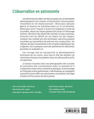Les décennies écoulées ont été marquées par un formidable développement des moyens d’observation astronomique. L’inventaire en est impressionnant : télescopes optiques géants et réseaux de radiotélescopes sur le sol terrestre, télescopes dans l’espace à toutes les longueurs d’onde de la lumière, depuis les rayons gamma et X jusqu’à l’infrarouge lointain. Découvrir des objets très lointains ou peu lumineux, résoudre tous les détails de ces objets sur des images, analyser leur lumière par des techniques spectroscopiques nouvelles qui permettent de préciser leur composition, les vitesses de leurs mouvements et les champs magnétiques qui y règnent, voici quelques-unes des performances désormais possibles et analysées ici.