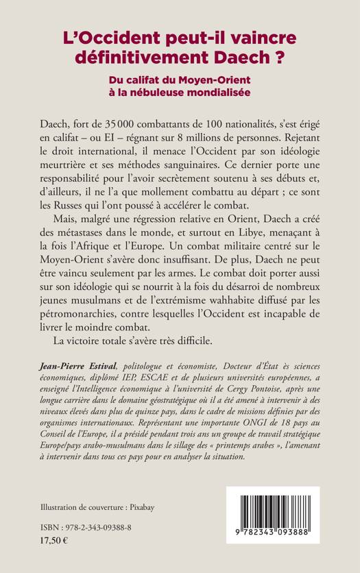 Fort de 35000 combattants, Daech menace l'Occident par son idéologie et ses méthodes sanguinaires. Malgré une régression relative en Orient, il a créé des métastases dans le monde, surtout en Libye. Un combat militaire centré sur le Moyen-Orient s'avère donc insuffisant. Le combat doit aussi porter sur son idéologie qui se nourrit à la fois du désarroi de nombreux jeunes musulmans et de l'extrémisme wahhabite diffusés par les pétromonarchies, contre lesquelles l'Occident est incapable de livrer le moindre combat.