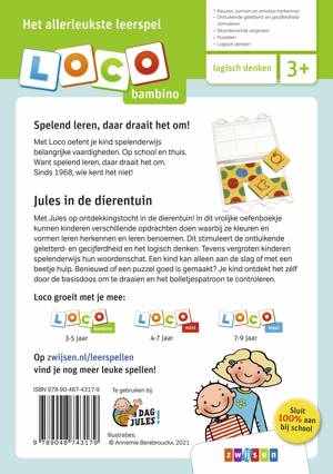 Met Jules op ontdekkingstocht in de dierentuin! In dit vrolijke oefenboekje kunnen kinderen verschillende opdrachten doen waarbij ze kleuren en vormen leren herkennen en leren benoemen. De ontluikende geletterd- en gecijferdheid en het logisch denken worden zo gestimuleerd. Tevens vergroten kinderen spelenderwijs hun woordenschat. Een kind kan alleen aan de slag of met een beetje hulp. Benieuwd of een puzzel goed is gemaakt? Je kind ontdekt het zélf door de basisdoos om te draaien en het bolletjespatroon te controleren.