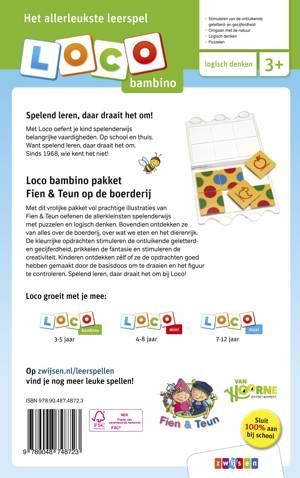 Vrolijk Loco bambino pakket vol prachtige illustraties van Fien & Teun op hun avonturenboerderij. De allerkleinsten leren spelenderwijs puzzelen en logisch denken. Bovendien ontdekken ze van alles over de boerderij, over wat we eten en over het dierenrijk. De kleurrijke opdrachten stimuleren de ontluikende geletterd- en gecijferdheid, prikkelen de fantasie en stimuleren de creativiteit. Kinderen ontdekken zélf of ze de opdrachten goed hebben gemaakt door de basisdoos om te draaien en het figuur te controleren. Spelend leren, daar draait het om bij Loco!