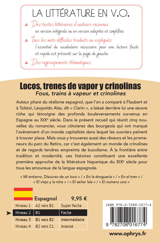 Auteur phare du réalisme espagnol, que l’on a comparé à Flaubert et à Tolstoï, Leopoldo Alas, dit « Clarin », a laissé derrière lui une œuvre riche qui témoigne des profonds bouleversements survenus en Espagne au XIXe siècle. Dans le présent recueil qui réunit cinq nouvelles du romancier, vous côtoierez des bourgeois qui ont marqué l’avènement d’un monde capitaliste dans lequel les ouvriers peinent à trouver place. Mais vous y trouverez aussi des rêveurs et les promeneurs du parc du Retiro, car c’est également un monde de crinolines et de regards tendres empreints de bucolisme. À la frontière entre tradition et modernité, ces histoires constituent une excellente première approche de la littérature hispanique du XIXe siècle pour tous les amoureux de la langue espagnole. La collection "Histoires faciles à lire" s’adresse à tous ceux qui ont envie de lire des textes littéraires en version originale. Les ouvrages regroupent par thèmes les textes d’auteurs connus et reconnus dans chacune des langues proposées. Les textes sont présentés sur la page de droite en version intégrale ou en version adaptée et simplifiée. L’essentiel du vocabulaire nécessaire est traduit sur la page de gauche pour une lecture facile, rapide et autonome. Chaque histoire est accompagnée d’un court appareil pédagogique à utiliser en classe ou en autonomie.