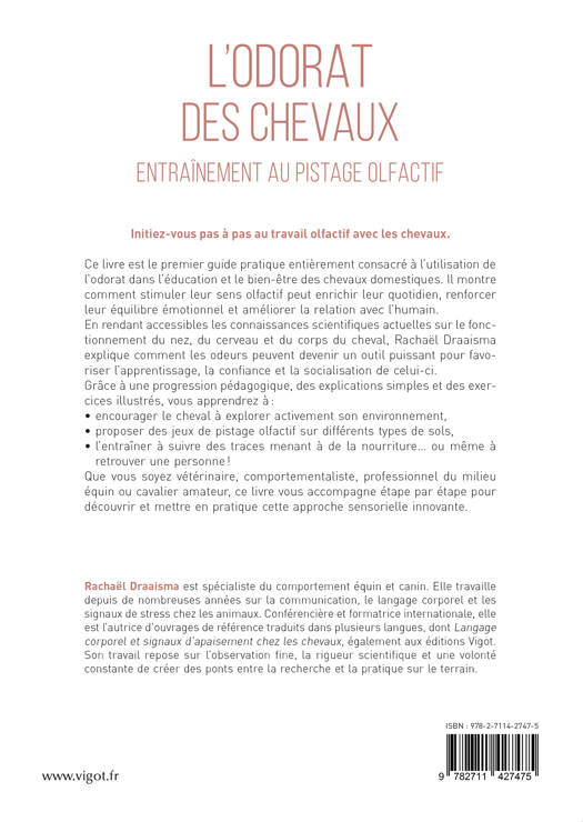 Initiez vous pas à pas au travail olfactif avec les chevaux. Ce livre est le premier guide pratique entièrement consacré à l’utilisation de l’odorat dans l’éducation et le bien-être des chevaux domestiques. Il montre comment stimuler leur sens olfactif peut enrichir leur quotidien, renforcer leur équilibre émotionnel et améliorer la relation avec l’humain. En rendant accessibles les connaissances scientifiques actuelles sur le fonctionnement du nez, du cerveau et du corps du cheval, Rachaël Draaisma explique comment les odeurs peuvent devenir un outil puissant pour favoriser l’apprentissage, la confiance et la socialisation de celui-ci. Grâce à une progression pédagogique, des explications simples et des exercices illustrés, vous apprendrez à : • encourager le cheval à explorer activement son environnement, • proposer des jeux de pistage olfactif sur différents types de sols, • l ’entraîner à suivre des traces menant à de la nourriture… ou même à retrouver une personne ! Que vous soyez vétérinaire, comportementaliste, professionnel du milieu équin ou cavalier amateur, ce livre vous accompagne étape par étape pour découvrir et mettre en pratique cette approche sensorielle innovante.