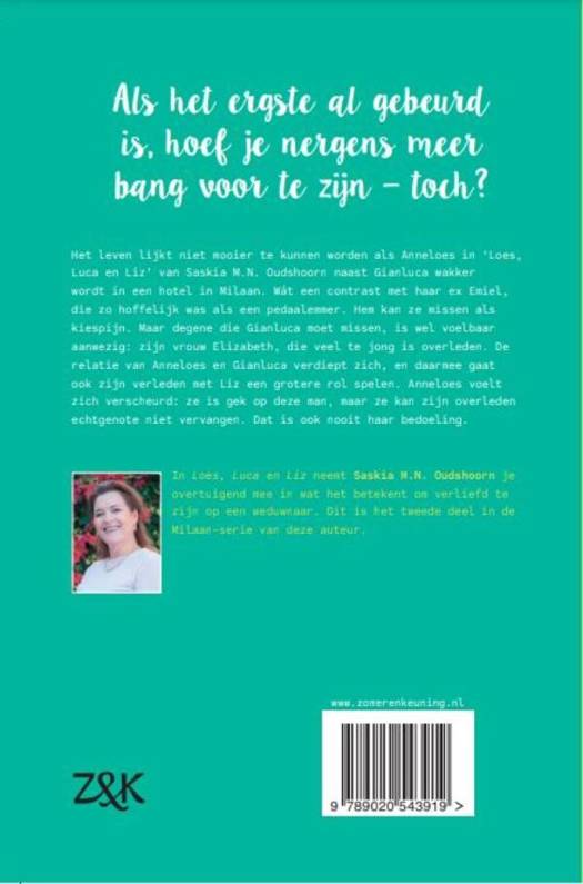 Het leven lijkt niet mooier te kunnen worden als Anneloes in 'Loes, Luca en Liz' van Saskia M.N. Oudshoorn naast Gianluca wakker wordt in een hotel in Milaan. Wát een contrast met haar ex Emiel, die zo hoffelijk was als een pedaalemmer. Hem kan ze missen als kiespijn. Maar degene die Gianluca moet missen, is wel voelbaar aanwezig: zijn vrouw Elizabeth, die veel te jong is overleden. In dit tweede deel van de serie 'Liefde in Milaan' verdiept de relatie van Anneloes en Gianluca zich, en daarmee gaat ook zijn verleden met Liz een grotere rol spelen. Anneloes voelt zich verscheurd: ze is gek op deze man, maar ze kan zijn overleden echtgenote niet vervangen. Dat is ook nooit haar bedoeling. In 'Loes, Luca en Liz' neemt Saskia M.N. Oudshoorn je overtuigend mee in wat het betekent om verliefd te zijn op een weduwnaar.