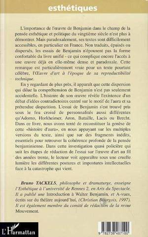 L'importance de l'uvre de Benjamin dans le champ de la pensée esthétique et politique du vingtième siècle n'est plus à démontrer. Dans ce livre, Bruno Tackels tente de reconstituer la genèse de cette " histoire d'aura ", en s'appuyant sur les multiples versions du texte, ainsi que sur des fragments inédits, essentiels pour retrouver la cohérence profonde de la pensée benjaminienne.