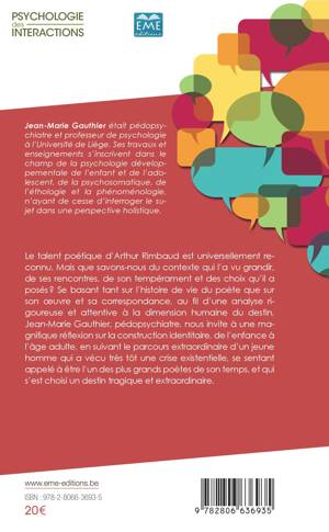 Le talent poétique d'Arthur Rimbaud est universellement reconnu. Mais que savons-nous du contexte qui l'a vu grandir, de ses rencontres, de son tempérament et des choix qu'il a posés ? Se basant tant sur l'histoire de vie du poète que sur son oeuvre et sa correspondance, Jean-Marie Gauthier nous invite à une réflexion originale sur la construction identitaire, de l'enfance à l'âge adulte, en suivant le parcours d'un jeune homme au talent hors du commun qui s'est choisi un destin tragique.