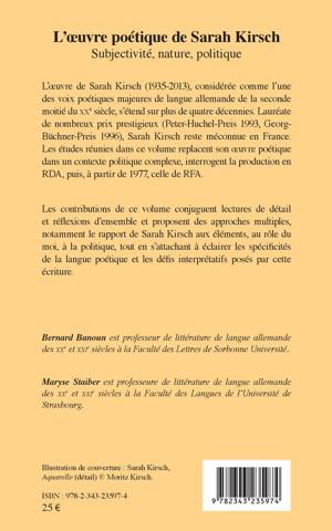 L'uvre de Sarah Kirsch (1935-2013), considérée comme l'une des voix poétiques majeures de langue allemande de la seconde moitié du XXe siècle, s'étend sur plus de quatre décennies. Lauréate de nombreux prix prestigieux (Peter-Huchel-Preis 1993, Georg-Büchner-Preis 1996), Sarah Kirsch reste méconnue en France. Les études réunies dans ce volume replacent son uvre poétique dans un contexte politique complexe, interrogent la production en RDA, puis, à partir de 1977, celle de RFA.