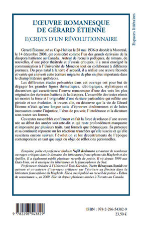 Gérard Étienne est considéré comme l'un des grands écrivains de la diaspora haïtienne au Canada. Du pays natal à la terre d'accueil, il a réalisé une oeuvre féconde et variée qui a investi cette écriture migrante de plus en plus importante dans le champ littéraire québécois. Les différentes études présentées dans cet ouvrage ont pour but de dégager les grandes lignes thématiques, idéologiques, stylistiques et discursives qui caractérisent son oeuvre romanesque.