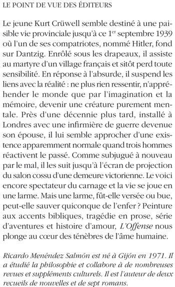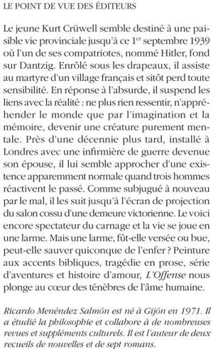 Le jeune Kurt Crüwell semble destiné à une paisible vie provinciale jusqu'à ce 1er septembre 1939 où l'un de ses compatriotes, nommé Hitler, fond sur Dantzig. Enrôlé sous les drapeaux, il assiste au martyre d'un village français et sitôt perd toute sensibilité. En réponse à l'absurde, il suspend les liens avec la réalité : ne plus rien ressentir, n'appréhender le monde que par l'imagination et la mémoire, devenir une créature purement mentale. Près d'une décennie plus tard, installé à Londres avec une infirmière de guerre devenue son épouse, il lui semble approcher d'une existence apparemment normale quand trois hommes réactivent le passé. Comme subjugué à nouveau par le mal, il les suit jusqu'à l'écran de projection du salon cossu d'une demeure victorienne. Le voici encore spectateur du carnage et la vie se joue en une larme. Mais une larme, fût-elle versée ou bue, peut-elle sauver quiconque de l'enfer ? Peinture aux accents bibliques, tragédie en prose, série d'aventures et histoire d'amour, L'Offense nous plonge au coeur des ténèbres de l'âme humaine.