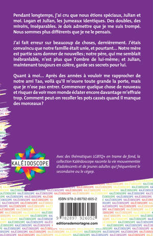 Pendant longtemps, j'ai cru que nous étions spéciaux, Julian et moi. Logan et Julian, les jumeaux identiques. Des doubles, des miroirs, inséparables. Je dois admettre que je me suis trompé. Nous sommes plus différents que je ne le pensais. J'ai fait erreur sur beaucoup de choses, dernièrement. J'étais convaincu que notre famille était unie, et pourtant... Notre mère est partie sans donner de nouvelles ; notre père, qui me semblait inébranlable, n'est plus que l'ombre de lui-même ; et Julian, maintenant toujours en colère, garde ses secrets pour lui. Quant à moi... Après des années à vouloir me rapprocher de notre ami Tao, voilà qu'il m'ouvre toute grande la porte, mais que je n'ose pas entrer. Commencer quelque chose de nouveau et risquer de voir mon monde éclater encore davantage m'effraie trop. Comment peut-on recoller les pots cassés quand il manque des morceaux ?