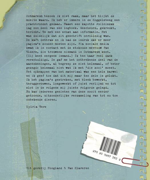 Ootmarsum bezoek ik niet vaak, maar het blijkt de moeite waard. Ik heb er immers in de Koggelsteeg een prachtvondst gedaan. Naast een kapotte vuilniszak lag een deel van een logboek. Gescheurd, gekreukt, bevlekt. En met een schat aan informatie. Het was duidelijk dat dit geschrift onvolledig was. De kaft ontbrak en ik had de indruk dat er meer pagina’s zouden moeten zijn. Via sociale media kwam ik in contact met de stokoude mevrouw Van Elders, die trouwens niemand in Ootmarsum kent. (Zij kent nergens iemand.) Ik ben haar veel dank verschuldigd. Ze gaf me het ontbrekende deel van de aantekeningen, al begreep ze niet helemaal, of beter gezegd: helemaal niet wat ik met ‘die zooi’ moest. Het opknappen van het materiaal was een hels karwei en ik geef toe dat dit mij maar ten dele is gelukt. Ik heb pagina’s gestreken, met bleek bewerkt, teruggevouwen, losgeweekt of juist verlijmd en tot slot in de, volgens mij juiste volgorde gelegd. Nu kan iedereen genieten van deze nooit eerder getoonde, uitzonderlijke verzameling van tot nu toe onbekende dieren.