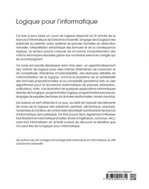 Cet ouvrage débute par une introduction à la logique des prédicats du premier ordre : syntaxe, sémantique et preuves formelles. Il guide ensuite le lecteur vers quelques uns de ses aspects plus avancés : théorème de complétude, théorème d'indécidabilité. Se tournant ensuite vers les rapports de la logique et de l'informatique, il présente les méthodes algorithmiques de démonstration automatique comme la résolution et l'unification ainsi que des applications plus directes des concepts logiques au domaine informatique (problème SAT, bases de données relationnelles, vérification de modèle, etc.)