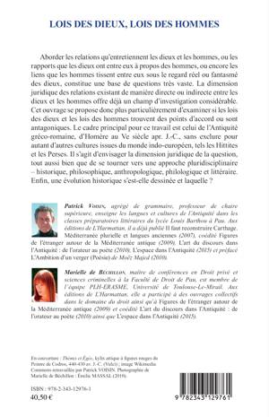 Aborder les relations entre les dieux et les hommes, ou les rapports que les dieux ont entre eux à propos des hommes, ou encore les liens tissés entre hommes sous le regard des dieux, constitue un vaste champ d'investigation. Les lois des dieux et les lois des hommes s'accordent-elles ou non ? Le cadre principal de ce travail est l'Antiquité gréco-romaine, sans exclure le monde indo-européen. Il s'agit d'envisager la dimension juridique et de mobiliser une approche pluridisciplinaire, de l'histoire à la littérature. Enfin, une évolution historique s'est-elle dessinée et laquelle ?