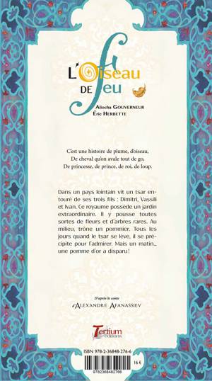C’est une histoire de plume, d’oiseau, De cheval qu’on avale tout de go, De princesse, de prince, de roi, de loup. Dans un pays lointain vit un tsar entouré de ses trois fils : Dimitri, Vassili et Ivan. Ce royaume possède un jardin extraordinaire. Il y pousse toutes sortes de fleurs et d’arbres rares. Au milieu, trône un pommier. Tous les jours quand le tsar se lève, il se précipite pour l’admirer. Mais un matin… une pomme d’or a disparu ! D’après le conte d’Alexandre Afanassiev