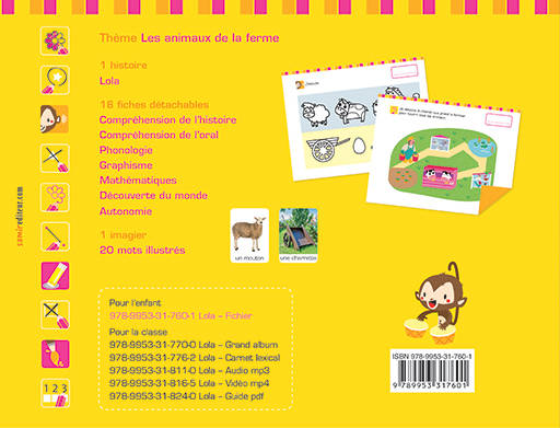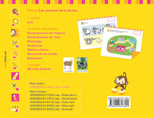 Thèmes : Les animaux de la ferme. 1 histoire : Lola. 16 fiches détachables : Compréhension de l'histoire. Compréhension de l'oral. Phonologie. Graphisme. Mathématiques. Découverte du monde. Autonomie. 1 imagier. 20 mots illustrés