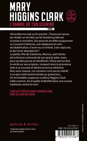 Olivia Morrow sait sa fin proche: l'heure est venue de révéler un terrible secret familial qu'elle est la seule à connaître. Qui pourrait en effet soupçonner sa cousine Catherine, une religieuse en voie de béatification, d'avoir eu un enfant, à dix-sept ans, et de l'avoir abandonné ? La petite-fille de Catherine, Monica, doit hériter de la fortune colossale de son grand- père, mais, pour qu'elle puisse en bénéficier, Olivia doit lui dire ce qu'il en est des origines de celui-ci, rompant ainsi la promesse faite à sa cousine et déshonorant sa mémoire. Non sans risque, car certains n'ont aucun intérèt à ce que la vérité éclate au grand jour... Un formidable suspense où la grande Mary Higgins Clark mèle science, foi et quète d'identité dans une course haletante contre la mort.