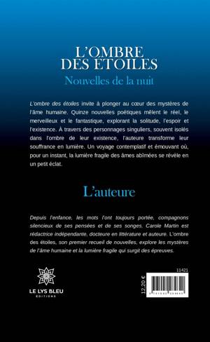 L'ombre des étoiles invite à plonger au coeur des mystères de l'âme humaine. Quinze nouvelles poétiques mêlent le réel, le merveilleux et le fantastique, explorant la solitude, l'espoir et l'existence. À travers des personnages singuliers, souvent isolés dans l'ombre de leur existence, l'auteure transforme leur souffrance en lumière. Un voyage contemplatif et émouvant où, pour un instant, la lumière fragile des âmes abîmées se révèle en un petit éclat.