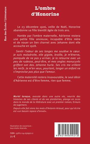 Le 23 décembre 1906, veille de Noël, Honorine abandonne sa fille bientôt âgée de trois ans. Hantée par l'ombre maternelle, Adrienne restera une petite fille anxieuse, incapable d'être mère et de nouer un lien charnel avec Jehanne dont elle accouche en 1928. Sentir l'odeur de ses langes me soulève le cœur. Je suis maladroite, elle gigote, braille, je m'énerve, paniquée de ne pas y arriver, je la retourne avec un peu de rudesse, peut-être, et mes ongles manucurés griffent son dos. Jehanne hurle. Ses cris me vrillent les nerfs. Je m'en veux, pourtant, langer un enfant ne s'improvise pas plus que l'amour. Cette maternité restera insavourable, le seul désir d'Adrienne est d'être femme, rien que femme.
