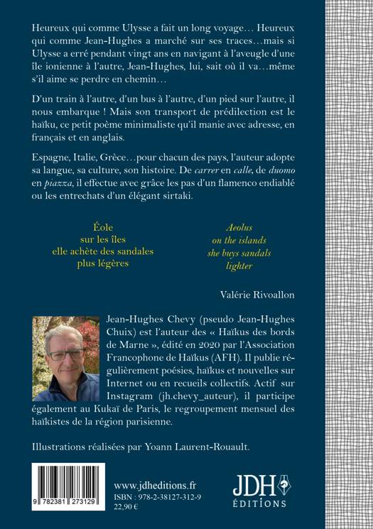 Heureux qui comme Ulysse a fait un long voyage... Heureux qui comme Jean-Hughes a marché sur ses traces...mais si Ulysse a erré pendant vingt ans en navigant à l'aveugle d'une île ionienne à l'autre, Jean-Hughes, lui, sait où il va...même s'il aime se perdre en chemin... D'un train à l'autre, d'un bus à l'autre, d'un pied sur l'autre, il nous embarque ! Mais son transport de prédilection est le haïku, ce petit poème minimaliste qu'il manie avec adresse, en français et en anglais. Espagne, Italie, Grèce...pour chacun des pays, l'auteur adopte sa langue, sa culture, son histoire. De "carrer" en "calle", de "duomo" en "piazza", il effectue avec grâce les pas d'un flamenco endiablé ou les entrechats d'un élégant sirtaki. Jean-Hughes Chevy (pseudo Jean-Hughes Chuix) est l'auteur des Haïkus des bords de Marne, édité en 2020 par l'Association Francophone de Haïkus (AFH). Il publie régulièrement poésies, haïkus et nouvelles sur Internet ou en recueils collectifs. Actif sur Instagram (jh.chevy_auteur), il participe également au Kukaï de Paris, le regroupement mensuel des haïkistes de la région parisienne. Illustrations réalisées par Yoann Laurent-Rouault.