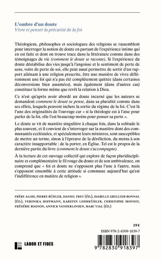Théologiens, philosophes ou sociologues des religions se rassemblent pour interroger la notion de doute en partant de l’expérience intime qui en est faite et dont on trouve trace non seulement dans la littérature (comment le doute se raconte ?), mais aussi dans des témoignages de vie (comment le doute se vit ?). Si l’expérience du doute déstabilise des vies jusqu’à l’angoisse et le sentiment de perte de sens, voire de perte de soi, il peut aussi être une reconfiguration de la foi essentielle pour sortir d’un rapport aliénant à une religion prescrite. Ce n’est qu’après avoir abordé un doute incarné que les auteurs se demanderont comment le doute se pense, car « si la théologie est à l’aise pour parler de la foi, elle l’est beaucoup moins pour penser sa perte ». À la lecture de cet ouvrage collectif qui explore de façon pluridisciplinaire et complémentaire le fil rouge du doute et de son ambivalence, on comprend que « foi et doute ne s’opposent plus l’une à l’autre, mais s’opposent ensemble à cette attitude si commune aujourd’hui qu’est l’indifférence en matière de religion ».