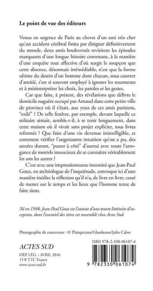Car que faire, à présent, des révélations que délivre le domicile naguère occupé par Arnaud dans cette petite ville de province où il s'était, aux yeux de ces amis parisiens, "exilé" ? De telle fenêtre, par exemple, devant laquelle ce solitaire aimait, semble-t-il, à se tenir longuement, dans cette maison où il vivait sans projet explicite, tous livres refermés ? Que faire d'une vie devenue inintelligible, et comment vérifier l'angoissante intuition qu'on a pu, des années durant, "passer à côté" d'autrui avec toute l'arrogance de mortels insoucieux de se connaître véritablement les uns les autres ?