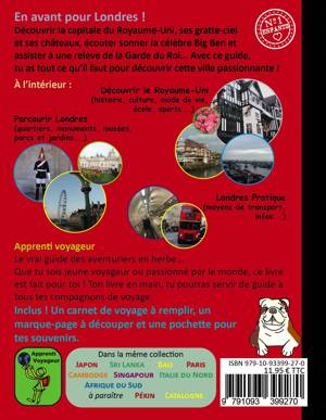 En avant pour Londres !<br /> Le vrai guide des aventuriers en herbe !<br /> Découvrir la capitale du Royaume-Uni, ses gratte-ciel et ses châteaux, écouter sonner la célèbre Big<br /> Ben et assister à une relève de la Garde du Roi... Destiné aux jeunes, voyageurs ou passionnés par le<br /> monde, ce livre contient tout ce qu’il faut pour appréhender cette ville passionnante et servir de<br /> guide à tous ses compagnons de voyage.<br /> Contenu : Une section pour découvrir le Royaume-Uni et ses habitants : géographie, histoire,<br /> culture, mode vie, arts, gastronomie, sports, faune et flore... Une section de visite de Londres<br /> par thèmes : quartiers, monuments, musées, nature, lieux de loisirs, aux alentours... Une section<br /> pratique : moyens de transport, infos pratiques, conseils, langues.<br /> Les petits plus : une mise en page attractive (colorée, textes courts, nombreuses photos et<br /> illustrations), une section pour décrire ses expériences de voyage, une pochette pour conserver ses<br /> souvenirs, un marque-page à découper.