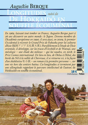 En 1969, laissant tout tomber en France, Augustin Berque part à 26 ans découvrir un autre monde : le Japon. Devenu membre de l’Académie européenne en 1990, il sera aussi, en 2009, le premier Occidental à recevoir le Grand Prix de Fukuoka pour les cultures d’Asie (福岡アジア文化賞大賞). Parallèlement à l’étude de l’Asie orientale, il développe, sur les traces d’Uexküll et de Watsuji, une mésologie – une étude des milieux – qui lui vaudra, en 2018, le Prix Cosmos international. De lieu en lieu, de l’Atlas à l’Altaï, des bords du Nil à la vallée de Chevreuse, il se retourne ici, à la façon d’un shishôsetsu 私小説 – un roman à la première personne –, sur une vie hors des sentiers battus. Ces longitudes se terminent par une allongitude rappelant le parcours intellectuel de l’auteur, “De Hokkaidô en souffle écouménal”.