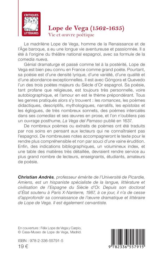 Le madrilène Lope de Vega, homme de la Renaissance et de l'Âge baroque, a eu une longue vie aventureuse et passionnée. Il a été à l'origine du théâtre national espagnol, avec sa formule de la comedia nueva. Génial dramaturge et passé comme tel à la postérité, Lope de Vega est bien peu connu en France comme grand poète. Pourtant, sa poésie est d'une densité lyrique, d'une variété, d'une qualité et d'une abondance exceptionnelles. Il est avec Góngora et Quevedo l'un des trois poètes majeurs du Siècle d'Or espagnol. Sa poésie, tant profane que religieuse, est toujours très personnelle, voire autobiographique, et l'amour en est le thème prépondérant. Tous les genres pratiqués alors s'y trouvent les romances, les poèmes didactiques, descriptifs, mythologiques, narratifs, les epístolas et les églogues, de très nombreux sonnets, des poèmes intercalés dans ses comedias et ses oeuvres en prose, et l'on n'oubliera pas un ouvrage posthume, La Vega del Parnaso publié en 1637. De nombreux poèmes ou extraits de poèmes ont été traduits par nos soins en pensant aux lecteurs qui ne connaîtraient pas l'espagnol. De nombreuses notes accompagneront le texte pour le rendre plus compréhensible et non par souci d'une vaine érudition. Enfin, des indications bibliographiques, un volumineux index, et une table des matières très détaillée, devraient rendre service au plus grand nombre de lecteurs, enseignants, étudiants, amateurs de poésie.