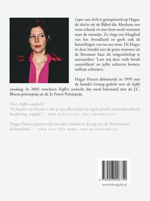 Loper van licht is geïnspireerd op Hagar, de slavin uit de Bijbel die Abraham een zoon schonk en met hem werd verstoten naar de woestijn. Ze zingt een klaaglied van het Avondland en geeft ook de bannelingen van nu een stem. De Hagar in deze bundel tart de grote mannen uit de literatuur om haar als reisgezelschap te aanvaarden: `Laat mij deze vuile broek aantrekken/ en jullie achterna komen, stelletje schooiers.