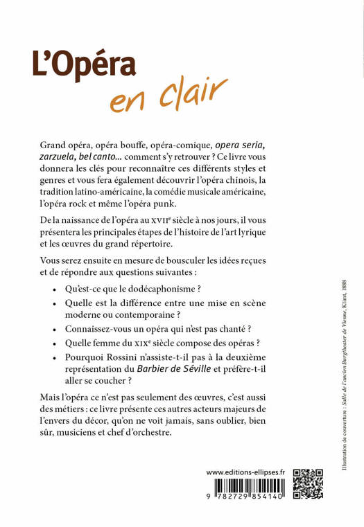 Grand opéra, opéra bouffe, opéra-comique, opera seria, zarzuela, bel canto… comment s’y retrouver ? Ce livre vous donnera les clés pour reconnaître ces différents styles et genres et vous fera également découvrir l’opéra chinois, la tradition latino-américaine, la comédie musicale américaine, l’opéra rock et même l’opéra punk.