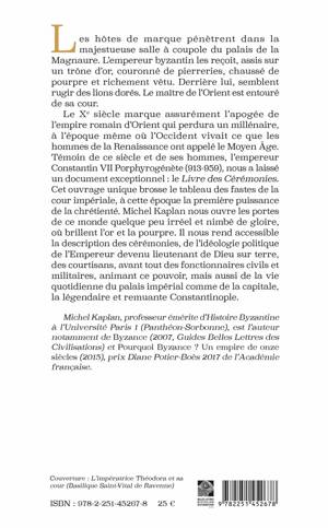 Les hotes de marque penetrent dans la majestueuse salle a coupole du palais de la Magnaure. L'empereur byzantin les recoit, assis sur un trone d'or, couronne de pierreries, chausse de pourpre et richement vetu. Derriere lui, semblent rugir des lions dores. Le maitre de l'Orient est entoure de sa cour. Le Xe siecle marque assurement l'apogee de l'empire romain d'Orient qui perdura un millenaire, a l'epoque meme ou l'Occident vivait ce que les hommes de la Renaissance ont appele le Moyen Age. Temoin de ce siecle et de ses hommes, l'empereur Constantin VII Porphyrogenete (913-959), nous a laisse un document exceptionnel: le Livre des Ceremonies. Cet ouvrage unique brosse le tableau des fastes de la cour imperiale, a cette epoque la premiere puissance de la chretiente. Michel Kaplan nous ouvre les portes de ce monde quelque peu irreel et nimbe de gloire, ou brillent l'or et la pourpre. Il nous rend accessible la description des ceremonies, de l'ideologie politique de l'Empereur devenu lieutenant de Dieu sur terre, des courtisans, avant tout des fonctionnaires civils et militaires, animant ce pouvoir, mais aussi de la vie quotidienne du palais imperial comme de la capitale, la legendaire et remuante Constantinople.