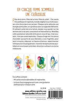 Filles de la terre, filles de la lune, filles du soleil... Cet oracle très poétique et inspiré du monde végétal vous invite à puiser votre force dans vos racines. Chaque carte véhicule une énergie particulière, en symbiose avec la magie des éléments. En attisant votre lien à la nature, laissez-vous guider sur les sentiers de la vie avec conscience et bienveillance. Réveillez cette puissance naturelle enfouie en vous et qui, trop souvent, n'est pas assez exploitée. Chaque tirage est l'occasion d'accéder aux parts de vous blessées, à vos fragilités, pour venir ensuite y déposer un baume d'amour, expérimenter votre pouvoir d'autoguérison, traverser les épreuves du quotidien en nourrissant votre bien-être et en cultivant vos terres intérieures.