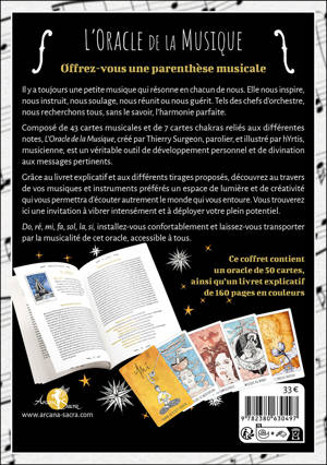 Offrez-vous une parenthèse musicale… Il y a toujours une petite musique qui résonne en chacun de nous. Elle nous inspire, nous instruit, nous soulage, nous réunit ou nous guérit. Tels des chefs d’orchestre, nous recherchons tous, sans le savoir, l’harmonie parfaite. Composé de 43 cartes musicales et de 7 cartes chakras reliés aux différentes notes, L’Oracle de la Musique, créé par Thierry Surgeon, parolier, et illustré par hYrtis, musicienne, est un véritable outil de développement personnel et de divination aux messages pertinents. Grâce au livret explicatif et aux différents tirages proposés, découvrez au travers de vos musiques et instruments préférés un espace de lumière et de créativité qui vous permettra d’écouter autrement le monde qui vous entoure. Vous trouverez ici une invitation à vibrer intensément et à déployer votre plein potentiel. Do, ré, mi, fa, sol, la, si, installez-vous confortablement et laissez-vous transporter par la musicalité de cet oracle, accessible à tous. Ce coffret contient un oracle de 50 cartes, ainsi qu’un livret explicatif de 160 pages en couleurs.