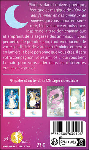 Plongez dans l’univers poétique, féerique et magique de L'Oracle des femmes et des animaux de pouvoir, qui vous apportera sérénité, bienveillance et puissance. Inspiré de la tradition chamanique et empreint de la sagesse des animaux, il vous permettra de prendre soin, tout en douceur, de votre sensibilité, de votre part féminine et mettra en lumière la belle personne que vous êtes. Il sera votre compagnon, votre ami, celui qui vous tient la main pour vous aider dans les différentes étapes de votre vie.