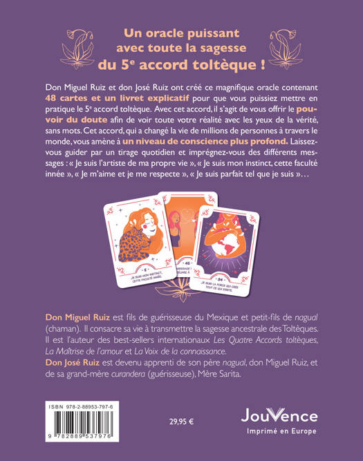 Don Miguel Ruiz et don José Ruiz ont créé ce magnifique oracle contenant 48 cartes et un livret explicatif pour que vous puissiez mettre en pratique le 5e accord toltèque. Avec cet accord, il s’agit de vous offrir le pouvoir du doute afin de voir toute votre réalité avec les yeux de la vérité, sans mots. Cet accord, qui a changé la vie de millions de personnes à travers le monde, vous amène à un niveau de conscience plus profond. Laissez-vous guider par un tirage quotidien et imprégnez-vous des différents messages : « Je suis l’artiste de ma propre vie », « Je suis mon instinct, cette faculté innée », « Je m’aime et je me respecte », « Je suis parfait tel que je suis »…