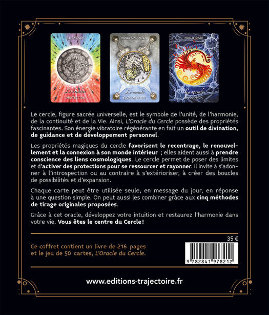Le cercle, figure sacrée universelle, est le symbole de l'unité, de l'harmonie, de la continuité et de la Vie. Ainsi, "L'Oracle du Cercle" est conçu comme un outil de divination et de développement personnel qui favorise le recentrage et la connexion à son monde intérieur ou inversement qui aide à prendre conscience de nos liens cosmologiques. Chaque carte peut être utilisée seule, en message du jour, en réponse à une question simple. On peut aussi les combiner grâce aux cinq méthodes de tirage originales proposées. Grâce à cet oracle, développez votre intuition et restaurez l'harmonie dans votre vie. Vous êtes le centre du Cercle?!