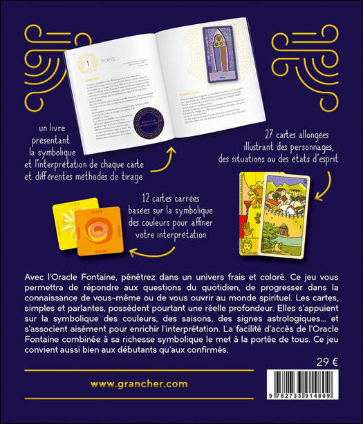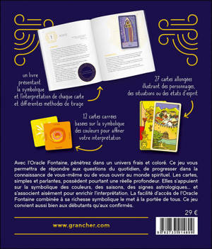 Avec l’Oracle Fontaine, pénétrez dans un univers frais et coloré. Ce jeu vous permettra de répondre aux questions du quotidien, de progresser dans la connaissance de vous-même ou de vous ouvrir au monde spirituel. Les cartes, simples et parlantes, possèdent également une réelle profondeur. Elles s’appuient sur la symbolique des couleurs, des saisons, des signes astrologiques… et s’associent aisément pour enrichir l’interprétation. La facilité d’accès de l’Oracle Fontaine combinée à sa richesse symbolique le met à la portée de tous. Ce jeu convient aussi bien aux débutants qu’aux confirmés. Ce coffret comprend : un livre présentant la symbolique et l’interprétation de chaque carte et différentes méthodes de tirage ; un jeu composé de 27 cartes allongées illustrant des personnages, des situations ou des états d’esprit et de 12 cartes carrées basées sur la symbolique des couleurs pour affiner notre interprétation.